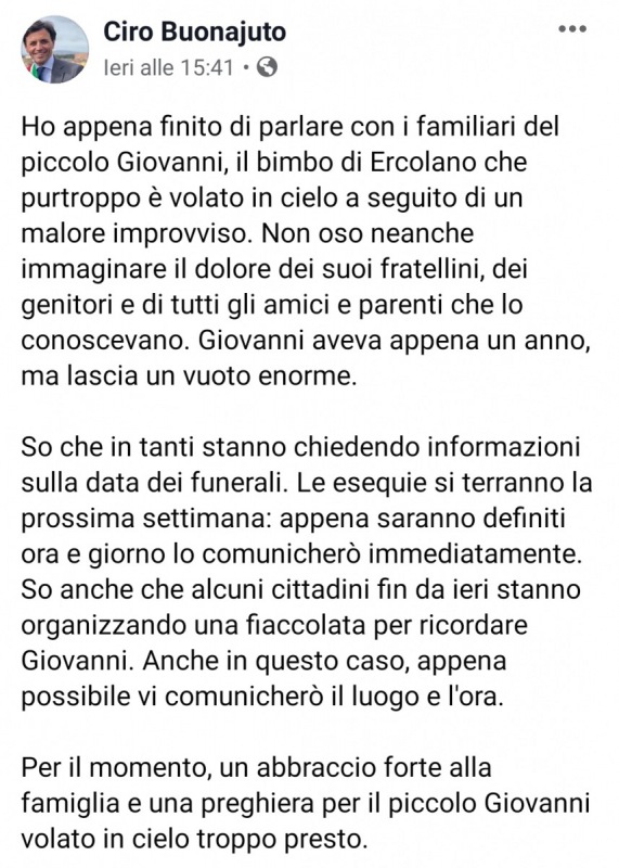 "Ho appena finito di parlare con i familiari del piccolo Giovanni, il bimbo di Ercolano che purtroppo è volato in cielo a seguito di un malore improvviso. Non oso neanche immaginare il dolore dei suoi fratellini, dei genitori e di tutti gli amici e parenti che lo conoscevano. Giovanni aveva appena un anno, ma lascia un vuoto enorme. So che in tanti stanno chiedendo informazioni sulla data dei funerali. Le esequie si terranno la prossima settimana: appena saranno definiti ora e giorno lo comunicherò immediatamente. So anche che alcuni cittadini fin da ieri stanno organizzando una fiaccolata per ricordare Giovanni. Anche in questo caso, appena possibile vi comunicherò il luogo e l'ora. Per il momento, un abbraccio forte alla famiglia e una preghiera per il piccolo Giovanni volato in cielo troppo presto."