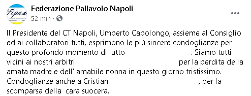 Lo apprendiamo dalla pagina Facebook Federazione Pallavolo Napoli.