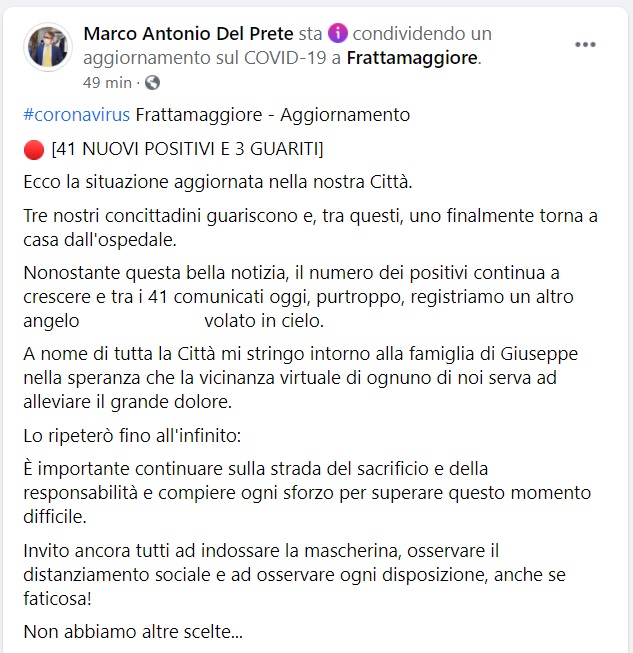 Questo quanto comunicato sulla pagina FB del Sindaco di Frattamaggiore