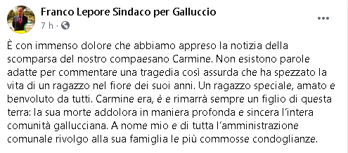 "È con immenso dolore che abbiamo appreso la notizia della scomparsa del nostro compaesano Carmine. Non esistono parole adatte per commentare una tragedia così assurda che ha spezzato la vita di un ragazzo nel fiore dei suoi anni. Un ragazzo speciale, amato e benvoluto da tutti. Carmine era, è e rimarrà sempre un figlio di questa terra: la sua morte addolora in maniera profonda e sincera l’intera comunità gallucciana. A nome mio e di tutta l’amministrazione comunale rivolgo alla sua famiglia le più commosse condoglianze."