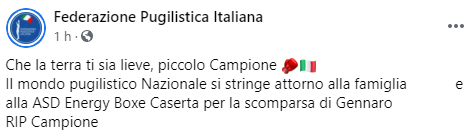 Questo parte del post pubblicato sulla pagina Facebook 'Federazione pugilistica Italiana': "Che la terra ti sia lieve, piccolo Campione.