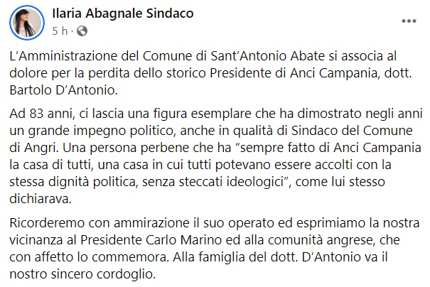 Questo il messaggio di cordoglio pubblicato sulla pagina facebook del Sindaco di S.Antonio Abate Ilaria Abagnale: "L’Amministrazione del Comune di Sant’Antonio Abate si associa al dolore per la perdita dello storico Presidente di Anci Campania, dott. Bartolo D’Antonio. Ad 83 anni - si legge nella nota -, ci lascia una figura esemplare che ha dimostrato negli anni un grande impegno politico, anche in qualità di Sindaco del Comune di Angri. Una persona perbene che ha “sempre fatto di Anci Campania la casa di tutti, una casa in cui tutti potevano essere accolti con la stessa dignità politica, senza steccati ideologici”, come lui stesso dichiarava. Ricorderemo con ammirazione il suo operato - si legge nella nota - ed esprimiamo la nostra vicinanza al Presidente Carlo Marino ed alla comunità angrese, che con affetto lo commemora. Alla famiglia del dott. D’Antonio va il nostro sincero cordoglio."