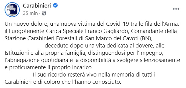 Questo quanto apprendiamo dalla pagina fb dei Carabinieri: "Un nuovo dolore, una nuova vittima del Covid-19 tra le fila dell’Arma: il Luogotenente Carica Speciale Franco Gagliardo, Comandante della Stazione Carabinieri Forestali - si legge nella nota - di San Marco dei Cavoti (BN), ... deceduto dopo una vita dedicata al dovere, alle Istituzioni e alla propria famiglia, distinguendosi per l’impegno, l’abnegazione quotidiana e la disponibilità a svolgere silenziosamente e proficuamente il proprio incarico. ... . Il suo ricordo resterà vivo nella memoria - si legge nella nota - di tutti i Carabinieri e di coloro che l’hanno conosciuto."