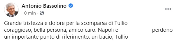 "Grande tristezza e dolore per la scomparsa di Tullio ... coraggioso, bella persona, amico caro. Napoli- si legge nella nota- e ... perdono un importante punto di riferimento: un bacio, Tullio"