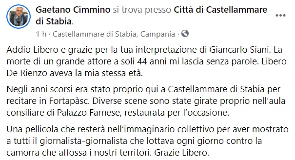 "Addio Libero e grazie per la tua interpretazione di Giancarlo Siani. La morte di un grande attore a soli 44 anni mi lascia senza parole. Libero De Rienzo aveva la mia stessa età. Negli anni scorsi era stato proprio qui a Castellammare di Stabia per recitare in Fortapàsc. Diverse scene sono state girate- si legge nella nota- proprio nell’aula consiliare di Palazzo Farnese, restaurata per l’occasione. Una pellicola che resterà nell’immaginario collettivo per aver mostrato a tutti il giornalista-giornalista che lottava ogni giorno contro la camorra che- si legge nella nota- affossa i nostri territori. Grazie Libero."
