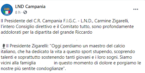 Questo parte del post pubblicato sulla pagina Facebook LND Campania: "Il Presidente del C.R. Campania F.I.G.C. - L.N.D., Carmine Zigarelli, l'intero Consiglio direttivo e il Comitato tutto - si legge nel post - sono profondamente addolorati per la dipartita del grande Riccardo (...). Il Presidente Zigarelli: "Oggi perdiamo un maestro del calcio italiano, che ha dedicato la vita a questo sport stupendo, scoprendo talenti e soprattutto sostenendo tanti giovani e i loro sogni. Siamo vicini alla famiglia (...) in questo momento di dolore - conclude il post - e porgiamo le nostre più sentite condoglianze".