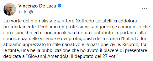 Questo il post pubblicato sulla sua pagina Facebook dal Presidente della Regione Campania Vincenzo De Luca: "La morte del giornalista e scrittore Goffredo Locatelli ci addolora profondamente. Perdiamo un professionista rigoroso e coraggioso che con i suoi libri ed i suoi articoli - si legge nel post - ha dato un contributo importante alla conoscenza delle vicende e dei protagonisti della storia d'Italia. Di lui abbiamo apprezzato lo stile narrativo e la passione civile. Ricordo, tra le tante, una bella pubblicazione che ho avuto il piacere di presentare - conclude il post - dedicata a "Giovanni Amendola. Il deputato dei 27 voti".