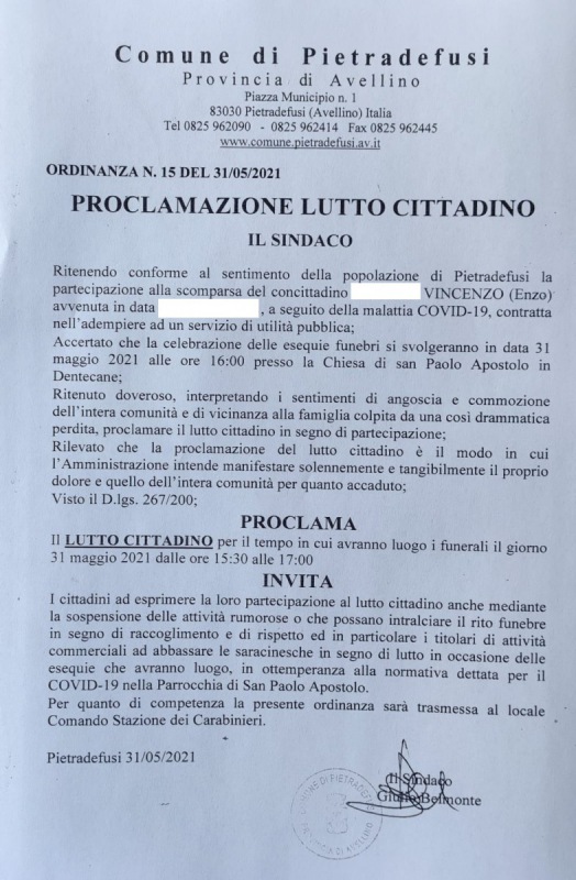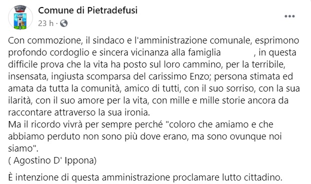 "Con commozione, il sindaco e l'amministrazione comunale, esprimono profondo cordoglio e sincera vicinanza alla famiglia ... , in questa difficile prova che la vita ha posto sul loro cammino, per la terribile, insensata, ingiusta scomparsa del carissimo Enzo; -si legge nella nota- persona stimata ed amata da tutta la comunità, amico di tutti, con il suo sorriso, con la sua ilarità, con il suo amore per la vita, con mille e mille storie ancora da raccontare attraverso la sua ironia. -Si legge nella nota- Ma il ricordo vivrà per sempre perché "coloro che amiamo e che abbiamo perduto non sono più dove erano, ma sono ovunque noi siamo". ( Agostino D' Ippona) È intenzione di questa amministrazione proclamare lutto cittadino."