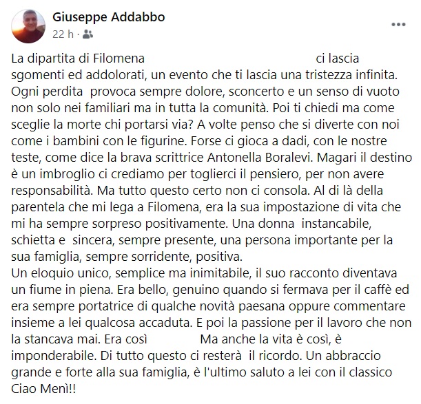 "La dipartita di Filomena ... ci lascia sgomenti ed addolorati, un evento che ti lascia una tristezza infinita. Ogni perdita provoca sempre dolore, sconcerto e un senso di vuoto non solo nei familiari ma in tutta la comunità. Poi ti chiedi ma come sceglie la morte chi portarsi via? A volte penso che- si legge nella nota- si diverte con noi come i bambini con le figurine. Forse ci gioca a dadi, con le nostre teste, come dice la brava scrittrice Antonella Boralevi. Magari il destino è un imbroglio ci crediamo per toglierci il pensiero, per non avere responsabilità. Ma tutto questo certo non ci consola. Al di là della parentela che mi lega a Filomena, era la sua impostazione di vita che mi ha sempre sorpreso positivamente. Una donna instancabile, schietta e sincera, sempre presente, una persona importante per la sua famiglia, sempre sorridente, positiva. Un eloquio unico, semplice ma inimitabile, il suo racconto diventava un fiume in piena. Era bello, genuino quando si fermava per il caffè ed era sempre portatrice di qualche novità paesana oppure commentare insieme a lei qualcosa accaduta. E poi- si legge nella nota- la passione per il lavoro che non la stancava mai. Era così ... Ma anche la vita è così, è imponderabile. Di tutto questo ci resterà il ricordo. Un abbraccio grande e forte alla sua famiglia, è l'ultimo saluto a lei con il classico Ciao Menì!!"