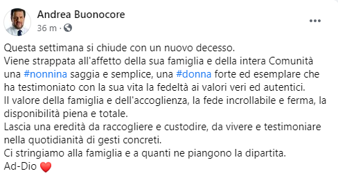 Questo il post pubblicato sulla sua pagina Facebook dal Sindaco di Vico Equense Andrea Buonocore: "Questa settimana si chiude con un nuovo decesso. Viene strappata all'affetto della sua famiglia e della intera Comunità una nonnina saggia e semplice, una donna forte ed esemplare che ha testimoniato con la sua vita - prosegue il post - la fedeltà ai valori veri ed autentici. Il valore della famiglia e dell'accoglienza, la fede incrollabile e ferma, la disponibilità piena e totale. Lascia una eredità da raccogliere e custodire, da vivere e testimoniare nella quotidianità di gesti concreti. Ci stringiamo - conclude il post - alla famiglia e a quanti ne piangono la dipartita. Ad-Dio".