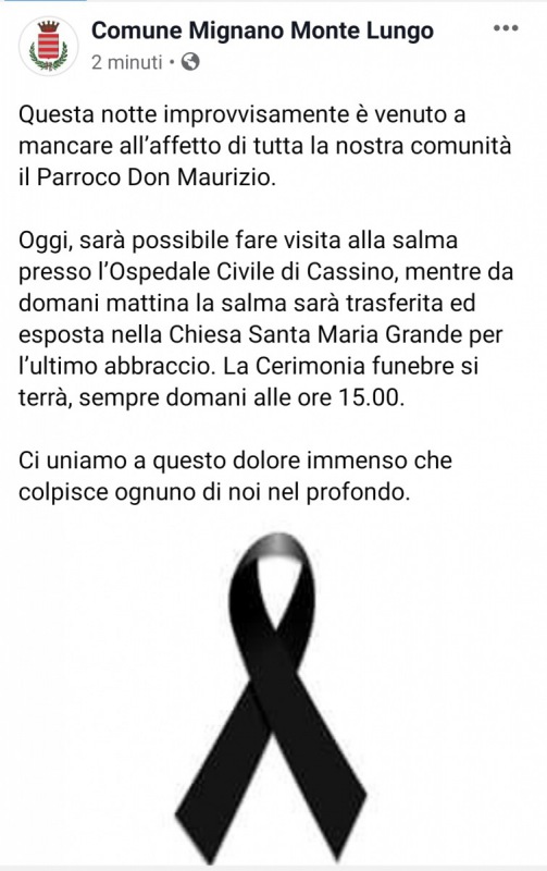 "Questa notte improvvisamente è venuto a mancare all’affetto di tutta la nostra comunità il Parroco Don Maurizio. Oggi, sarà possibile fare visita alla salma presso l’Ospedale Civile di Cassino, mentre da domani mattina la salma sarà trasferita ed esposta nella Chiesa Santa Maria Grande per l’ultimo abbraccio. La Cerimonia funebre si terrà, sempre domani alle ore 15.00. Ci uniamo a questo dolore immenso che colpisce ognuno di noi nel profondo."