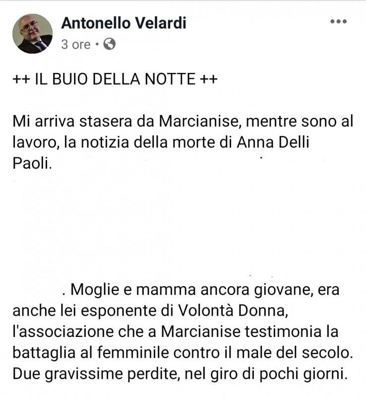 "Mi arriva stasera da Marcianise, mentre sono al lavoro, la notizia della morte di Anna Delli Paoli... Moglie e mamma ancora giovane, era anche lei esponente di Volontà Donna, l'associazione che a Marcianise testimonia la battaglia al femminile contro il male del secolo. Due gravissime perdite, nel giro di pochi giorni..."