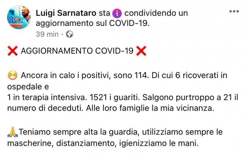 Questo quanto pubblicato sulla pagina facebook del Sindaco di Mugnano