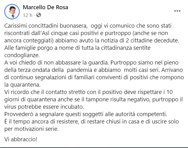 "Carissimi concittadini buonasera, oggi vi comunico che sono stati riscontrati dall’Asl cinque casi positivi e purtroppo (anche se non ancora conteggiati) abbiamo avuto la notizia di 2 cittadine decedute. Alle famiglie porgo a nome di tutta la cittadinanza sentite condoglianze. A voi- si legge nella nota- chiedo di non abbassare la guardia. Purtroppo siamo nel pieno della terza ondata della pandemia e abbiamo molti casi seri. Arrivano di continuo segnalazioni di familiari conviventi di positivi che rompono la quarantena. Vi ricordo che il contatto stretto con il positivo deve rispettare i 10 giorni di quarantena anche se il tampone risulta negativo, purtroppo il virus potrebbe essere incubato. Provvederò a segnalare questi soggetti alle autorità competenti. È il tempo ancora di resistere, di restare chiusi in casa e- si legge nella nota- di uscire solo per motivazioni serie. Vi abbraccio!"