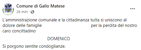 Questo il post pubblicato sulla pagina Facebook 'Comune di Gallo Matese': "L'amministrazione comunale e la cittadinanza tutta si uniscono al dolore delle famiglie (...) per la perdita - si legge nel post - del nostro caro concittadino Domenico. Si porgono sentite condoglianze".