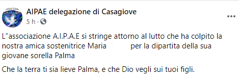 Questo parte del post pubblicato sulla pagina Facebook 'AIPAE delegazione di Casagiove: "L'associazione A.I.P.A.E si stringe attorno al lutto che ha colpito la nostra amica sostenitrice Maria (...), per la dipartita - si legge nel post - della sua giovane sorella Palma (...). Che la terra ti sia lieve Palma, e che Dio vegli sui tuoi figli".