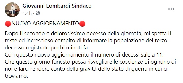 "Dopo il secondo e dolorosissimo decesso della giornata, mi spetta il triste ed increscioso compito di informare la popolazione del terzo decesso registrato pochi minuti fa. -Si legge nella nota- Con questo nuovo aggiornamento il numero di decessi sale a 11. Che questo giorno funesto possa risvegliare le coscienze di ognuno di noi e farci rendere conto della gravità dello stato di guerra in cui ci troviamo"