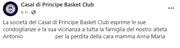 "La società del Casal di Principe Basket Club esprime le sue condoglianze e la sua vicinanza a tutta la famiglia del nostro atleta Antonio ... per la perdita della cara mamma Anna Maria ..."