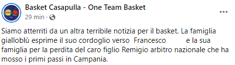 Questo parte del post pubblicato sulla pagina Facebook 'Basket Casapulla - One team Basket': "Siamo atterriti da un'altra terribile notizia per il basket. La famiglia gialloblù esprime il suo cordoglio - si legge nel post - verso Francesco (...) e la sua famiglia per la perdita del caro figlio Remigio arbitro nazionale che ha mosso i primi passi in Campania".