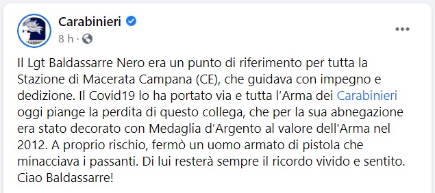 Questo il messaggio di cordoglio pubblicato sulla pagina fb dei Carabinieri: "Il Lgt Baldassarre Nero era un punto di riferimento per tutta la Stazione di Macerata Campana (CE), che guidava con impegno e dedizione. Il Covid19 - si legge nella nota - lo ha portato via e tutta l’Arma dei Carabinieri oggi piange la perdita di questo collega, che per la sua abnegazione era stato decorato con Medaglia d’Argento al valore dell'Arma nel 2012. A proprio rischio, fermò un uomo armato di pistola che minacciava i passanti. Di lui resterà sempre il ricordo vivido e sentito - si legge nella nota -. Ciao Baldassarre!"