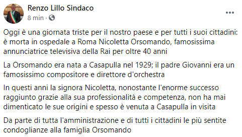 Questo il post pubblicato sulla sua pagina Facebook dal Sindaco di Casapulla Renzo Lillo: "Oggi è una giornata triste per il nostro paese e per tutti i suoi cittadini: è morta in ospedale a Roma Nicoletta Orsomando, famosissima annunciatrice televisiva della Rai per oltre 40 anni. La Orsomando - si legge nel post - era nata a Casapulla nel 1929; il padre Giovanni era un famosissimo compositore e direttore d'orchestra. In questi anni la signora Nicoletta - prosegue ancora il post - nonostante l'enorme successo raggiunto grazie alla sua professionalità e competenza, non ha mai dimenticato le sue origini e spesso è venuta a Casapulla in visita. Da parte di tutta l'amministrazione - conclude il post - e di tutti i cittadini le più sentite condoglianze alla famiglia Orsomando".