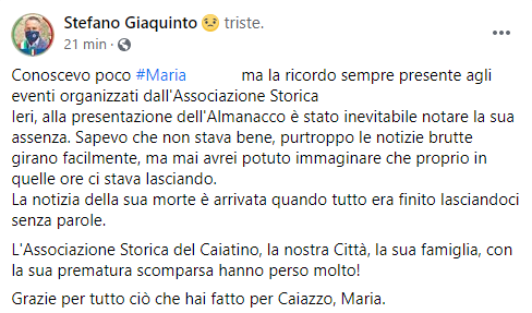 Questo parte del post pubblicato sulla sua pagina Faebook dal Sindaco di Caiazzo Stefano Giaquinto: "Conoscevo poco Maria (...), ma la ricordo sempre presente agli eventi organizzati dall'Associazione Storica (...). Ieri, alla presentazione dell'Almanacco è stato inevitabile notare la sua assenza. Sapevo - si legge nel post - che non stava bene, purtroppo le notizie brutte girano facilmente, ma mai avrei potuto immaginare che proprio in quelle ore ci stava lasciando. La notizia della sua morte è arrivata quando tutto era finito lasciandoci senza parole. L'Associazione Storica del Caiatino, la nostra Città - prosegue il post - la sua famiglia, con la sua prematura scomparsa hanno perso molto! Grazie per tutto ciò che hai fatto per Caiazzo, Maria".