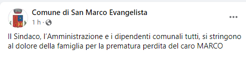 Questo parte del post pubblicato sulla pagina Facebook 'Comune di San Marco Evangelista': "Il Sindaco, l’Amministrazione e i dipendenti comunali tutti, si stringono al dolore della famiglia per la prematura perdita del caro Marco (...)".