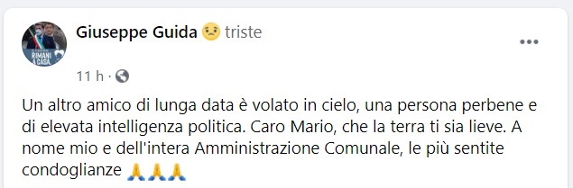 Questo il messaggio di cordoglio che apprendiamo dalla pagina facebook del Sindaco di Arienzo: "Un altro amico di lunga data è volato in cielo, una persona perbene e di elevata intelligenza politica - si legge nella nota -. Caro Mario, che la terra ti sia lieve. A nome mio e dell'intera Amministrazione Comunale, le più sentite condoglianze"