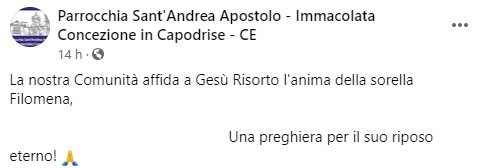 "La nostra Comunità affida a Gesù Risorto l'anima della sorella ... Filomena, ... Una preghiera- si legge nella nota- per il suo riposo eterno!"