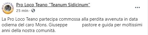Questo parte del post pubblicato sulla pagina Facebook 'Pro Loco Teano - Teanum Sidicinum': "La Pro Loco Teano partecipa commossa alla perdita avvenuta in data odierna del caro Mons. Giuseppe (...) - si legge nel post - pastore e guida per moltissimi anni della nostra comunità".