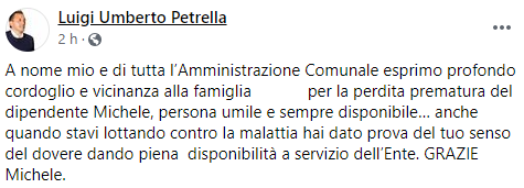 Questo parte del post pubblicato sulla sua pagina Facebook dal Sindaco di Castel Volturno Luigi Umberto Petrella: "A nome mio e di tutta l’Amministrazione Comunale esprimo profondo cordoglio e vicinanza alla famiglia (...) per la perdita prematura - si legge nel post - del dipendente Michele, persona umile e sempre disponibile… anche quando stavi lottando contro la malattia hai dato prova del tuo senso del dovere dando piena disponibilità a servizio dell’Ente. GRAZIE Michele".