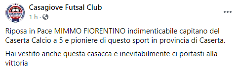 Questo il post pubblicato sulla pagina Facebook 'Casagiove Futsal': "Riposa in Pace MIMMO FIORENTINO indimenticabile capitano del Caserta Calcio a 5 e pioniere di questo sport in provincia di Caserta. Hai vestito - si legge nel post - anche questa casacca e inevitabilmente ci portasti alla vittoria".