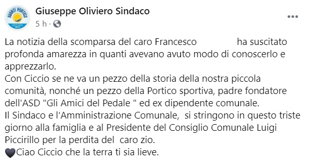 "La notizia della scomparsa del caro Francesco ... ha suscitato profonda amarezza in quanti avevano avuto modo di conoscerlo e apprezzarlo. Con Ciccio se ne va un pezzo della storia della nostra piccola comunità, nonché- si legge nella nota- un pezzo della Portico sportiva, padre fondatore dell'ASD "Gli Amici del Pedale " ed ex dipendente comunale. Il Sindaco e l'Amministrazione Comunale, si stringono in questo triste giorno alla famiglia e al Presidente del Consiglio Comunale Luigi Piccirillo per la perdita del caro zio. Ciao Ciccio che la terra ti sia lieve."