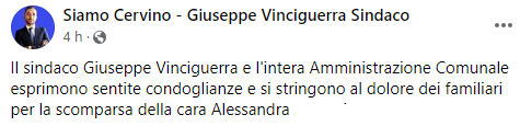 Questo parte del post pubblicato sulla pagina Facebook 'Siamo Cervino - Giuseppe Vinciguerra Sindaco': "Il Sindaco Giuseppe Vinciguerra e l'intera Amministrazione Comunale - si legge nel post - esprimono sentite condoglianze e si stringono al dolore dei familiari per la scomparsa della cara Alessandra (...)".