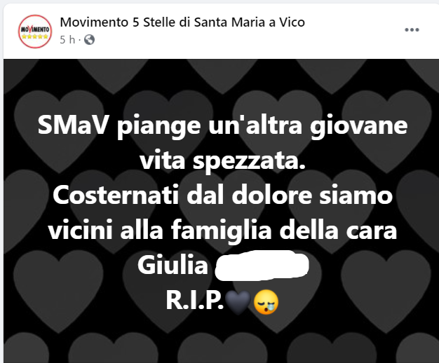 Questo il post pubblicato sulla pagina Facebook del Movimento 5 Stelle di Santa Maria a Vico: "SMaV piange un'altra giovane vita spezzata. Costernati dal dolore - si legge nel post - siamo vicini alla famiglia della cara Giulia (...) R.I.P."