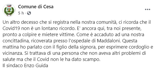 "Un altro decesso che si registra nella nostra comunità, ci ricorda che il Covid19 non è un lontano ricordo. E' ancora qui, tra noi presente, pronto a colpire e mietere vittime. Come è accaduto- si legge nella nota- ad una nostra concittadina, ricoverata presso l'ospedale di Maddaloni. Questa mattina ho parlato con il figlio della signora, per esprimere cordoglio e vicinanza. Si trattava di una persona che non aveva altri problemi di salute ma che il Covid non le ha dato scampo. Il sindaco Enzo Guida"