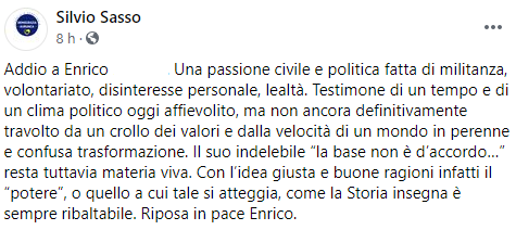 Questo il post pubblicato sulla sua pagina Facebook dall'ex Sindaco di Sessa Aurunca Silvio Sasso: "Addio a Enrico (...). Una passione civile e politica fatta di militanza, volontariato, disinteresse personale, lealtà. Testimone di un tempo e di un clima politico oggi affievolito, ma non ancora definitivamente travolto da un crollo dei valori e dalla velocità di un mondo in perenne e confusa trasformazione. Il suo indelebile “la base non è d’accordo…” resta tuttavia - si legge nel post - materia viva. Con l’idea giusta e buone ragioni infatti il “potere”, o quello a cui tale si atteggia, come la Storia insegna è sempre ribaltabile. Riposa in pace Enrico".
