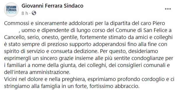 "Commossi e sinceramente addolorati per la dipartita del caro Piero ... , uomo e dipendente di lungo corso del Comune di San Felice a Cancello, serio, onesto, gentile, fortemente stimato da amici e colleghi è stato sempre di prezioso supporto adoperandosi fino alla fine con spirito di servizio e consueta dedizione. -Si legge nella nota- Per questo, desideriamo esprimergli un sincero grazie insieme alle più sentite condoglianze per i familiari a nome della giunta, dei colleghi, dei consiglieri comunali e dell’intera amministrazione. Vicini nel dolore e nella preghiera, esprimiamo profondo cordoglio e ci stringiamo alla famiglia in un forte, fortissimo abbraccio."