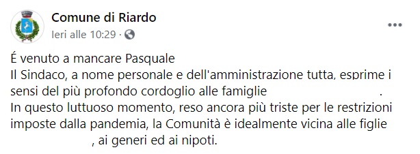"É venuto a mancare Pasquale ... Il Sindaco, a nome personale e dell'amministrazione tutta, esprime i sensi del più profondo cordoglio alle famiglie Della Torre e Iovino... -Si legge nella nota- In questo luttuoso momento, reso ancora più triste per le restrizioni imposte dalla pandemia, la Comunità è idealmente vicina alle figlie ... , ai generi ed ai nipoti."