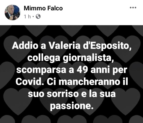 Lutto nel giornalismo. Si è spenta a 49 anni la collega Valeria D'Esposito, casertana e 'mamma' del sito, molto conosciuto a livello nazionale, 'visitcampania.it'. Questo il post del Presidente del Corecom Campania nonché Vice Pres. Ordine dei Giornalisti della Campania, Mimmo Falco