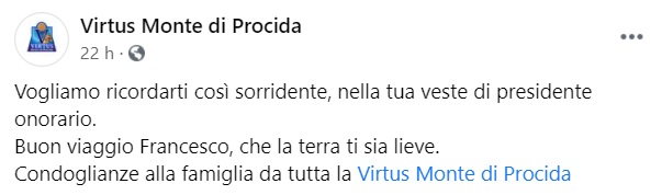 "Vogliamo ricordarti così sorridente, nella tua veste di presidente onorario. Buon viaggio Francesco, che la terra ti sia lieve. Condoglianze- si legge nella nota- alla famiglia da tutta la Virtus Monte di Procida"