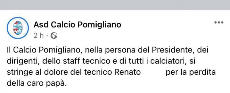Questo quanto pubblicato sulla pagina facebook della società Calcio Pomigliano