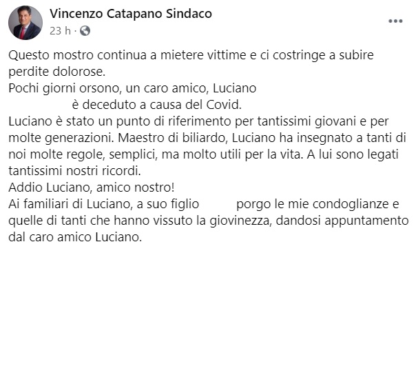"Questo mostro continua a mietere vittime e ci costringe a subire perdite dolorose. Pochi giorni orsono, un caro amico, Luciano ... è deceduto a causa del Covid. Luciano è stato un punto di riferimento per tantissimi giovani e per molte generazioni. Maestro di biliardo, Luciano ha insegnato- si legge nella nota- a tanti di noi molte regole, semplici, ma molto utili per la vita. A lui sono legati tantissimi nostri ricordi. Addio Luciano, amico nostro! Ai familiari di Luciano, a suo figlio ... porgo le mie condoglianze e quelle di tanti che hanno vissuto la giovinezza, dandosi appuntamento dal caro amico Luciano."