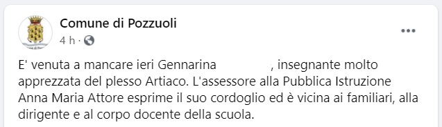 Questo il messaggio di cordoglio che apprendiamo dalla pagina facebook del Comune di Pozzuoli: "E' venuta a mancare ieri Gennarina ..., insegnante molto apprezzata del plesso Artiaco. L'assessore - si legge nella nota - alla Pubblica Istruzione Anna Maria Attore esprime il suo cordoglio ed è vicina ai familiari, alla dirigente e al corpo docente della scuola."