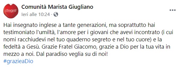 "Hai insegnato inglese a tante generazioni, ma soprattutto hai testimoniato l'umiltà, l'amore per i giovani che avevi incontrato (i cui nomi racchiudevi nel tuo quaderno segreto e nel tuo cuore) e- si legge nella nota- la fedeltà a Gesù. Grazie Fratel Giacomo, grazie a Dio per la tua vita in mezzo a noi. Dal paradiso veglia su di noi"