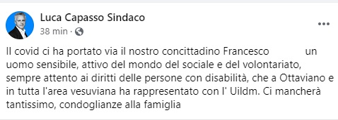 Questo parte del post pubblicato sulla sua pagina Facebook dal Sindaco di Ottaviano Luca Capasso: "Il covid ci ha portato via il nostro concittadino Francesco (...), un uomo sensibile, attivo del mondo del sociale e del volontariato, sempre attento ai diritti delle persone con disabilità, che a Ottaviano e in tutta l'area vesuviana ha rappresentato con l' Uildm. Ci mancherà tantissimo - conclude il post - condoglianze alla famiglia".
