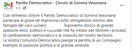 Questo parte del post pubblicato sulla pagina Facebook 'Partito Democratico - Circolo di Somma Vesuviana': "Con immenso dolore il Partito Democratico di Somma Vesuviana partecipa al grave ed improvviso lutto stringendosi intorno alla famiglia del caro Luciano (...). Esponente storico di grande spessore etico - si legge nel post - politico e culturale che ha lottato per favorire i processi di cambiamento democratico e la rinascita del nostro territorio. La nostra Comunità Democratica - conclude il post - piange la perdita di un Compagno esempio di passione politica e di grande umanità".
