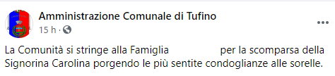 Questo il post pubblicato sulla pagina Facebook 'Amministrazione Comunale di Tufino': "La Comunità si stringe alla Famiglia (...) per la scomparsa della Signorina Carolina - si legge nel post - porgendo le più sentite condoglianze alle sorelle".