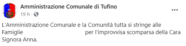 "L'Amministrazione Comunale e la Comunità tutta si stringe- si legge nella nota- alle Famiglie ... per l’improvvisa scomparsa della Cara Signora Anna."