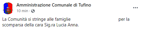 Questo il post pubblicato sulla pagina Facebook 'Amministrazione comunale di Tufino': "La Comunità si stringe alle famiglie (...) per la scomparsa della cara Sig.ra Lucia Anna".